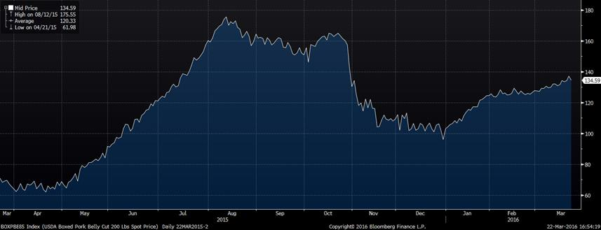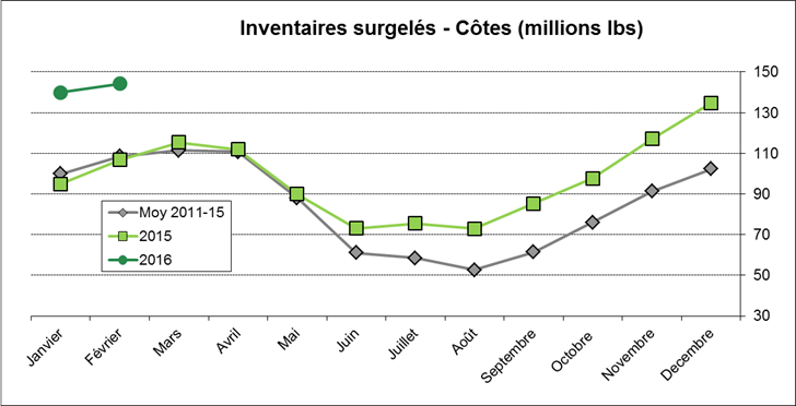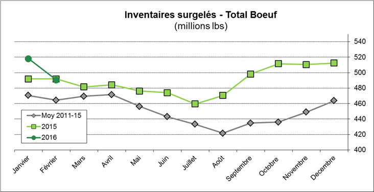 En février, le prix de la découpe de boeuf était relativement faible et a commencé à remonter seulement à la mi-mars. Apparemment, l’offre de bœuf en février ne suffisait pas pour combler la demande ce qui a fait baisser les inventaires surgelés de 28 millions livres à 490.6 millions (graphique 1). C’est un peu contradictoire à la baisse du prix des découpes. En janvier, les inventaires surgelés de bœuf était 5% de plus qu’en 2015 et 10% de plus que la moyenne quinquennale. Avec la baisse d’inventaire en février, nous sommes en direction vers un retour à la moyenne, désormais à seulement 5% de plus que la moyenne.