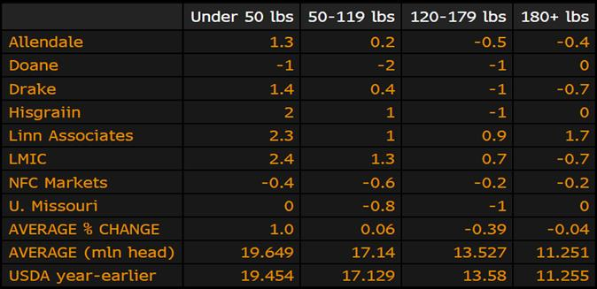 · Changement estimé du cheptel 50 lbs et moins: +1.0 % à 19.65 millions porcs