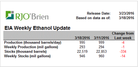 La production d’éthanol continue de frôler le 1million de barils par jour (tableau 1) ce qui est un peu plus que la cadence nécessaire pour atteindre la cible de l’USDA (graphique 2). Contrairement à cet hiver, en plus d’une forte production, les inventaires se contractent grâce à une demande de gazoline extrêmement forte, pratiquement à un record pour cette période de l’année, soit 9.50 million barils de gazoline par jour. Bref, les inventaires d’éthanol ont diminué de 334 000 barils à 22.5M barils la semaine dernière ce qui est un léger recul après les inventaires records de 23.3M barils il y a deux semaines.