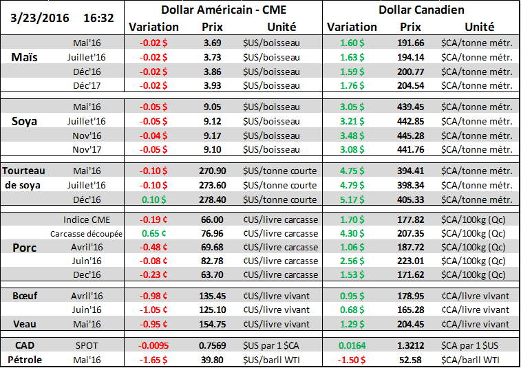 Blé : À 369k tonnes c’est respectable, c’est même mieux que prévu en réalité. Avec seulement 10 semaines à faire sur l’année de commercialisation 2015/16, il y a encore beaucoup de chemin à faire si le ministère pense atteindre 775 millions de boisseaux! À ce jour les ventes sont évaluée à 696 millions, soit une baisse de 17% par rapport à l’an dernier alors que l’USDA estime la baisse à seulement 9%. Il faudrait que les américains exporte en moyenne 7.6 millions de boisseaux par semaine sur la meme période ou l’an passé elles étaient à 2.0 par semaine. Bref, fort possible que l’USDA révise les exportations américaines de blé, mais je ne crois pas que cela va « surprendre » le marché.
