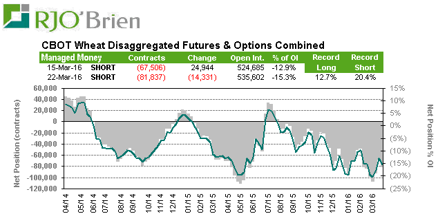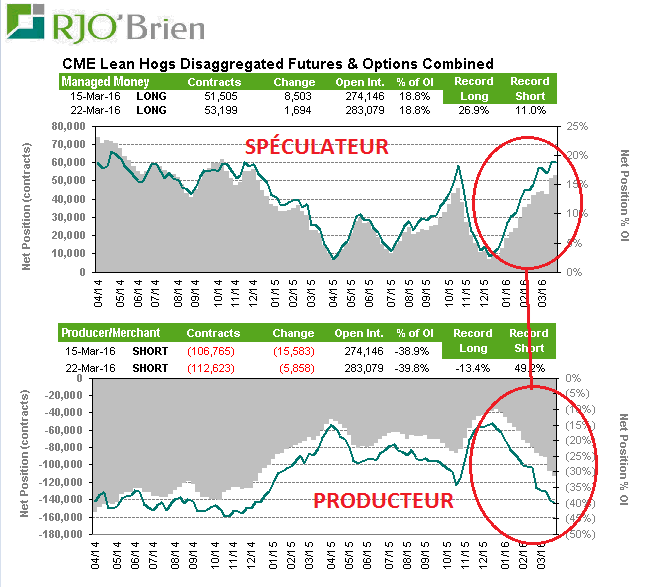 Blé Chicago : Les spéculateurs défendent leur position short encore cette semaine. Au net ils sont vendeur de 81,837 options/contrats, près des record de vente. La météo devrait commencer à brasser les cartes ; surveillez les conditions des cultures, le gel, la pluie, etc…. n’importe quel élément de mère nature suffisamment important pour rendre les spéculateurs nerveux et racheter massivement leur contrat. N’oubliez pas qu’au final c’est l’offre et la demande de grain qui mene, mais sur une courte période faut être conscient des joueurs en place pour saisir les opportunités.
