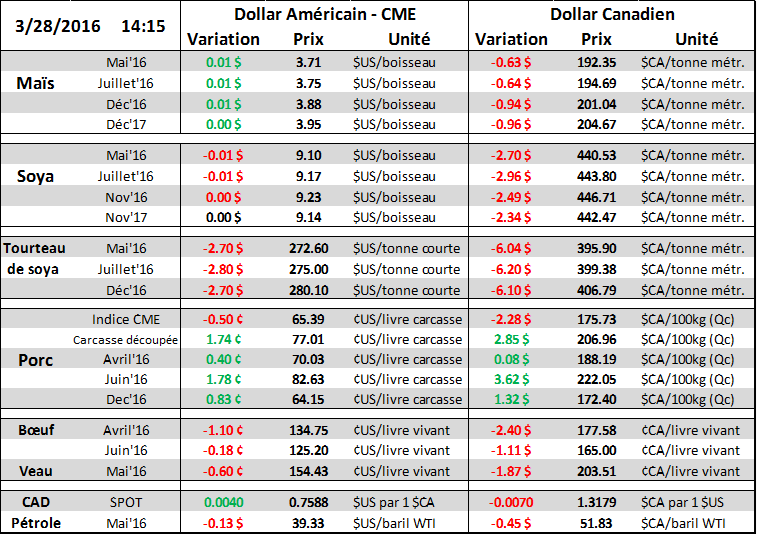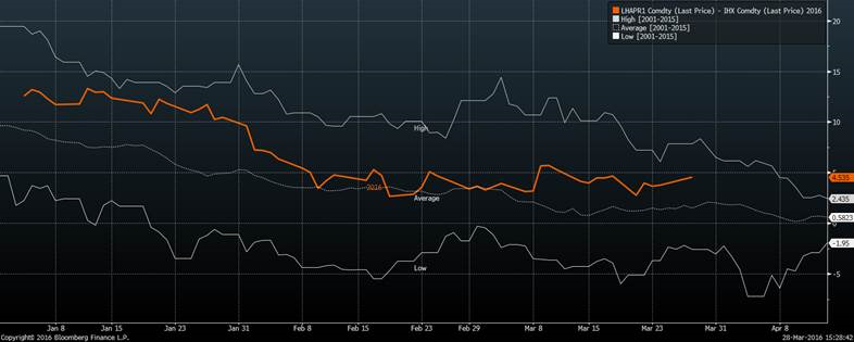 À court terme par contre l’écart entre le cash et le contrat d’avril demeure plus élevé qu’en moyenne. L’indice CME Lean Hog Index sera publié à en baisse de 0.33 à 65.06 demain, le contrat d’avril se négocie à pres de 5 cents de prime et le contrat expire le 14 avril. En fait le contrat d’avril a meme transigé à 71.675, soit quasiment 7 cents de prime durant la journée.
