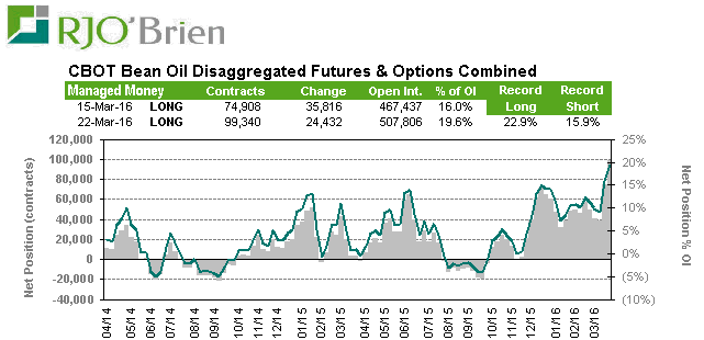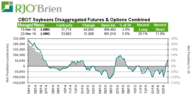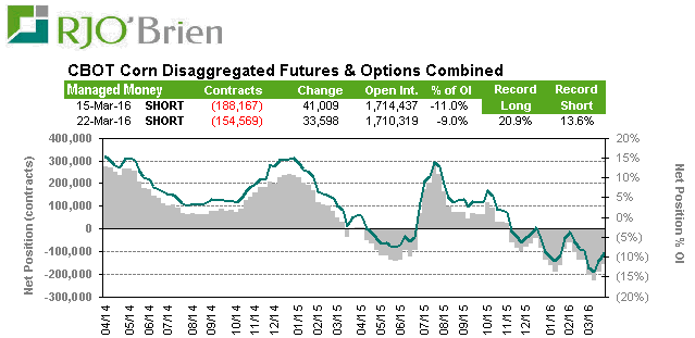 Corn : rachat de 33,598 options/contrat pour réduire le net short à 154,569. Globalement les spéculateurs sont encore très short, mais en deux semaines ils ont réduit significativement leur position. La position est à surveiller de plus en plus près alors que nous faisons la transition entre une marché de demande vers un marché de météo. Les informations clés de jeudi seront déterminantes non seulement sur le fondamental (offre-demande) mais aussi sur le technique et les fonds de spéculation pourraient mettre de la pression à court terme en attendant que la poussière retombe et que l’équilibre fondamentale entre l’offre et la demande ne reprenne le dessus.