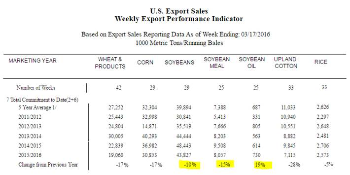 Huile de soja (soybean oil) : On parle souvent que les exportations américaines de grain sont faibles, même très faible. C’est vrai, sauf pour l’huile de soja qui fait cavalier seul – la faible production d’huile de palme en Asie fait augmenter la demande pour l’huile américaine. Sur l’année de commercialisation, les ventes de fève sont en baisse de 10%, les ventes de tourteau en baisse de 15% tandis que les ventes d’huile sont en hausse de 19%, un net contraste!