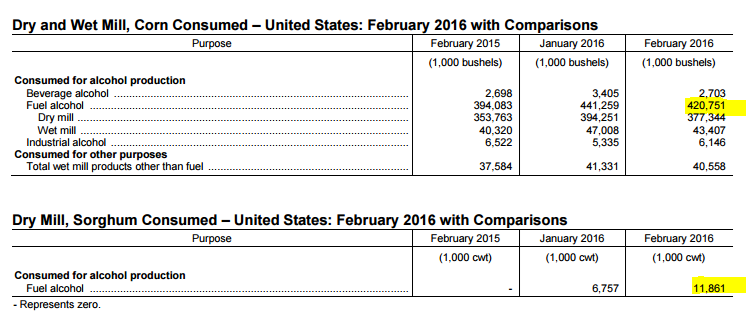 Vendredi après-midi l’USDA a publié le rapport Grain Crushing qui montre l’utilisation de maïs pour la transformation en éthanol (principalement). Le chiffre est sorti très fort ; 421 millions de boisseaux soit 7% plus élevé qu’en 2015. C’est beaucoup plus élevé que les attentes – les attentes sont fixées sur les chiffres hebdo de l’EIA quant à la production d’éthanol. En prenant les stats du mois de février et en utilisant un rendement moyen, nous nous attendions de voir 405-410 millions de boisseaux en transformation. Juste pour préciser, quand on parle de rendement pour l’éthanol, on parle ici du nombre de gallons d’éthanol obtenus avec 1 boisseau de maïs. Le chiffre de vendredi malgré la forte production m’apparait étrange ; il se serait consommé plus de mais que prévu. Habituellement le rendement tourne autour de 2.80 / 2.82 gallon par boisseau et là en février c’est une solide baisse à 2.719 et serait le plus faible rendement depuis le début des rapport Grain Crushing en octobre 2014. On s’attend donc à voir une correction dans les prochains mois. À mon avis ils pourrait revoir à la hausse la production implicite d’éthanol pour les mois précédent afin de retrouver plus de constance sur les rendements. En fait on peut jouer sur le output (éthanol) ou l’imput (maïs) pour retourner à un rendement plus « normal ». Ce sera intéressant de voir comment l’USDA agira sur cette question puisque si le rendement est réellement 2.72 le calcul de la demande implicite de maïs serait à ajuster dans les prochains WASDE. Actuellement le secteur éthanol compte pour 39% de la demande total avec 5.3 milliard de boisseaux.