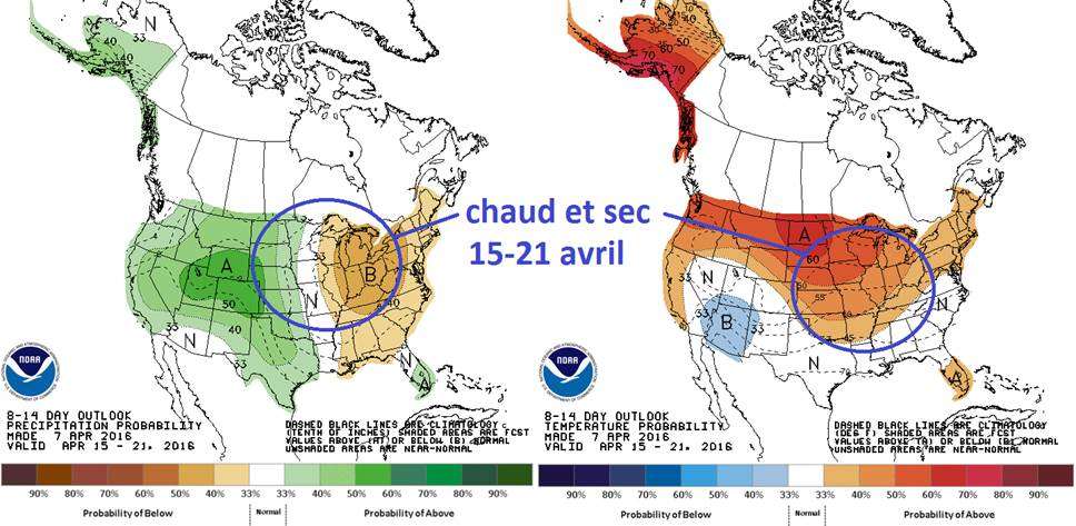 Coté méto les forecast sont bien dans l’ensemble pour débuter la saison dans le midwest. Les température devraient être plus chaudes qu’à la normale et le temps assez sec va favoriser le travail au champ.