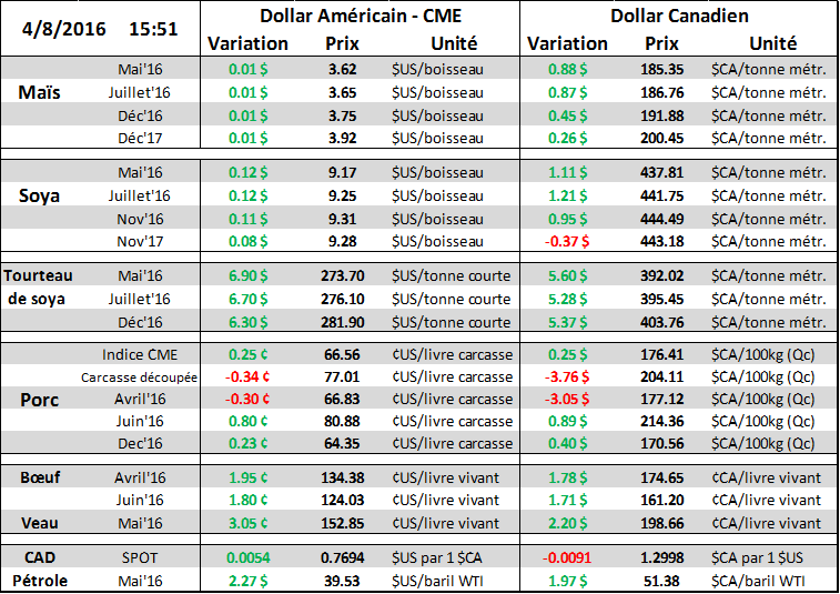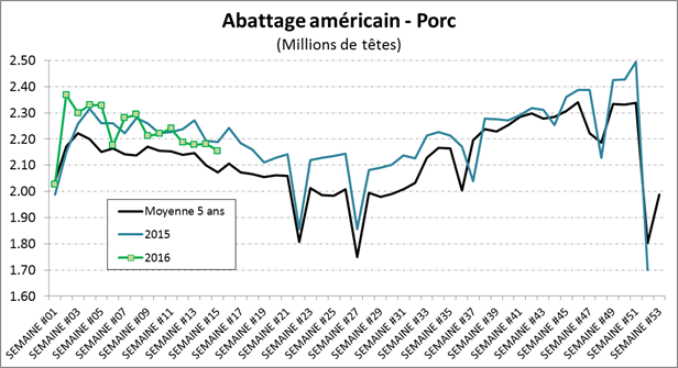 Au niveau bovin, la production hebdomadaire est estimée à 444.6 millions de livres, soit 8.9% de plus que l’an dernier. C’est fort probablement ce qui explique la baisse de 0.30 $US/lb depuis 1 an. Le poids moyen des bœufs est stable à 833 livres carcasse (1 374 livres vivant), soit un gain de 2.5% depuis 1 an. À cela s’ajoute la hausse des abattages de 6.2% avec 535 000 têtes. Depuis le début de l’année, la production de viande bovin est en hausse de 2.4% par rapport au début 2015, alors que la production de porc est en baisse de 1.6%. La plus forte baisse de production de viande rouge est celle d’agneau, en baisse de 16% cette semaine et de 4.8% depuis le début de l’année.