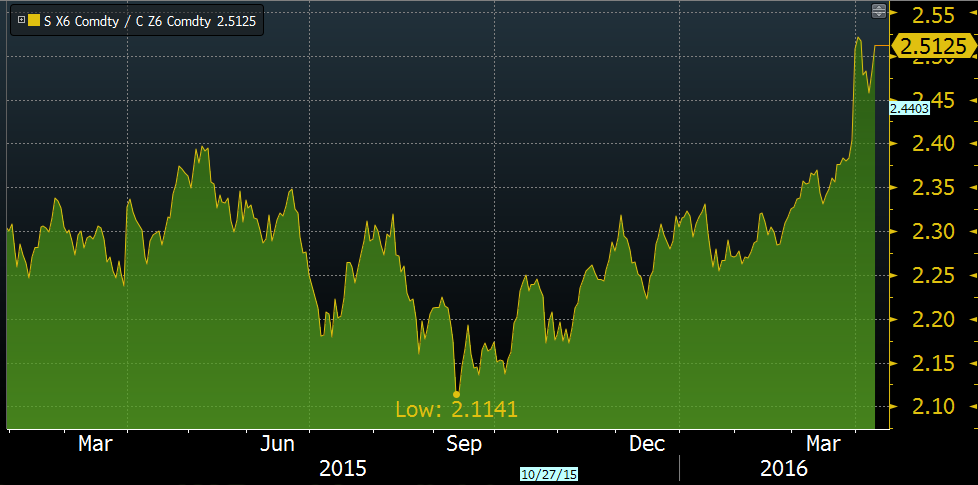 Ø Un transfert d’acréage du maïs vers le soya, mais faut pas s’attendre à des millions acres… Les analystes parlent de 91.5 M acres de maïs et 83.5 M acres de soya, ce sont que des suppositions. Voir graphique ci-dessous du ratio soya/maïs, grosse augmentation en mars ce qui explique la possible augmentation des superficies de soya.