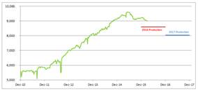 Pour le premier trimestre, la production américaine a été en moyenne de 9.1 millions de barils. Aujourd’hui, l’administration américaine sur l’énergie (IEA) a mis à jour ses prévisions. Ils anticipent une production moyenne de 8.60 millions pour 2016 puis 8.04 millions de barils par jour en 2017. La baisse de la production doit donc s’accélérer par rapport à que ce nous avons eu au cours des dernières semaines.