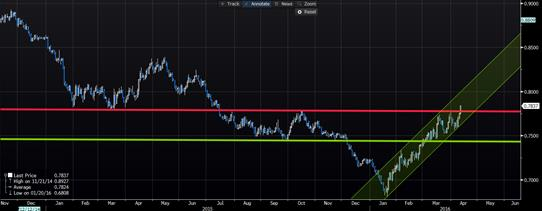 En brisant la résistance de 78 qui correspondait aux récents hauts, ainsi que ceux d’octobre et les bas du printemps dernier, le CAD ouvre la porte aux 80cts.