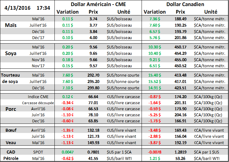 La production d’huile de palme en Asie s’annonce plus faible et les utilisateurs s’approvisionne en huile végétale ailleurs. Prix de l’huile soja en hausse constante depuis l’automne. Un rallye qui est lancé par un sous-produit, comme l’huile, est habituellement de courte durée ; le crush margin devient positif, la production accélère et ensuite on revient à l’équilibre. Pour ce qui est du tourteau, il y a un jump énorme dans les prix depuis quelques jours et on espère avoir la réponse à cette questions dans le rapport NOPA de vendredi. À priori le mouvement rapide fait état d’une rareté à court terme, pourtant la trituration en février était plus forte que prévu et aurait dû apporter son lot de tourteau… est-ce qu’en mars le crush était trop faible? Je me rappel de l’automne 2014 quand le tourteau a jumpé de 100$ la tonne est l’espace de quelques jours, mais il y a aujourd’hui une différence majeure! En 2014 il n’y avait pas de meal parce qu’il n’y avait pas de fève à écraser! Souvenez-vous des inventaires de fin d’à peine 92M de boisseaux. À ce moment la rareté était réelle et prolongée jusqu’à la nouvelle récolte. Aujourd’hui c’est différent, la fève est disponible, et en masse! Il s’agit de rééquilibrer le crush margin pour repartir la trituration et permettre un output de tourteau suffisant pour le feed – et du coup augmenter l’inventaire d’huile soja – une pierre deux coup vous direz. D’ailleurs, la production d’éthanol a été super bonne dernièrement et l’accès à la drèche devrait limiter la hausse du tourteau.