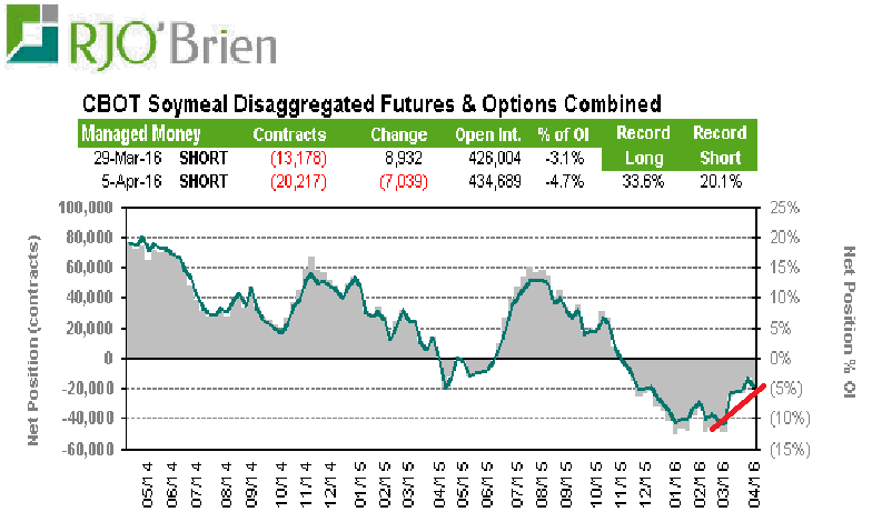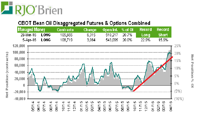 Les fonds de spéculation ont acheté un paquet de contrats à terme sur CBOT, près de 200,000 depuis un mois et c’est possible d’en ajouter si la situation prend de l’ampleur. Les fonds ont aussi un net long impressionnant dans les huiles et réduisent le net short dans le tourteau de façon assez claire. Définitivement quelque chose attirent leur intérêt.