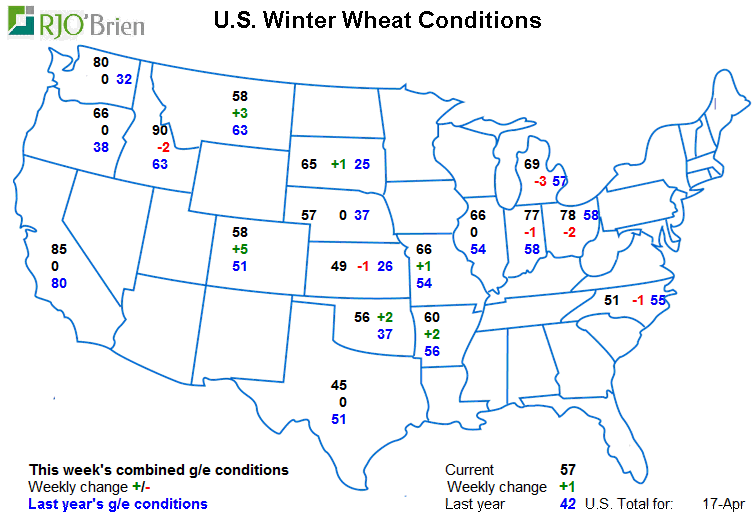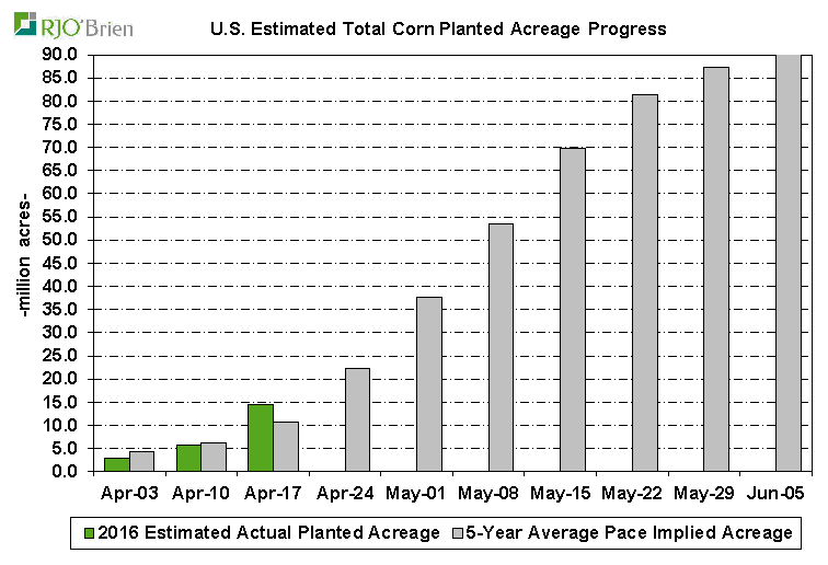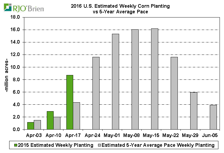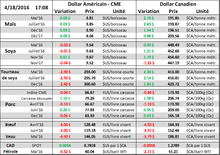 Maïs : Les semis sont en avance et la météo est clémente pour conserver/augmenter le rythme jusqu’à la fin du mois. Il y a de bonnes chances que près de la moitié des surfaces seraient dans la terre au 1er mai. À l’heure actuelle selon l’USDA, les américains auraient semés 8.7 millions d’acres cette semaine (14.5M à date), resterait donc 79.1 millions à semer pour atteindre la cible de 93.6 établie le 31 mars dernier.