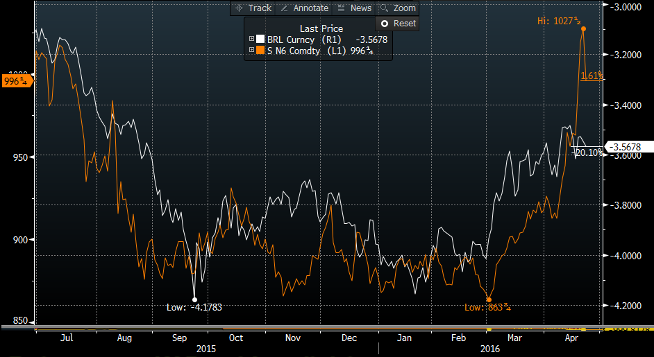 Amérique du Sud (Brésil) : Climat politique tendu au Brésil fait en sorte que la devise s’apprécie. Le marché fait l’argument que la force du Réal ralentira les export au profit du stock américain. Le graphe suivant met en relation le prix du soja et la devise Brésilienne pour mettre en évidence la corrélation actuelle.