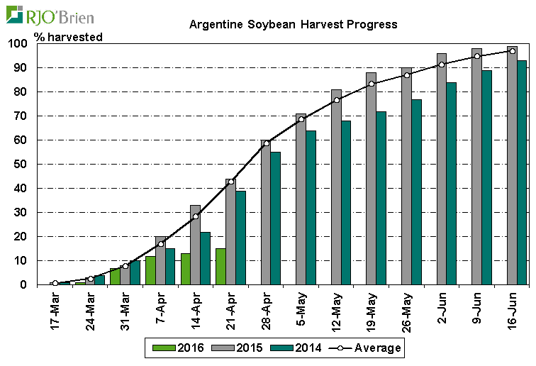 Amérique du Sud (Argentine) : Météo difficile pour finir la saison. On doute de la taille de la récolte, ainsi que sa qualité. Actuellement les récoltes sont en retard fortement. L’USDA prévoit 59MMT de fève pour l’Argentine, mais ce sera surement revu en baisse selon plusieurs – 55/56MMT semble être la moyenne des estimés. Donc en réalité on parle d’une baisse d’environ 1% de la production mondiale dans une année de surplus record…. À peine 15% du soja est récolté (44% en moyenne!) faut en tenir compte.