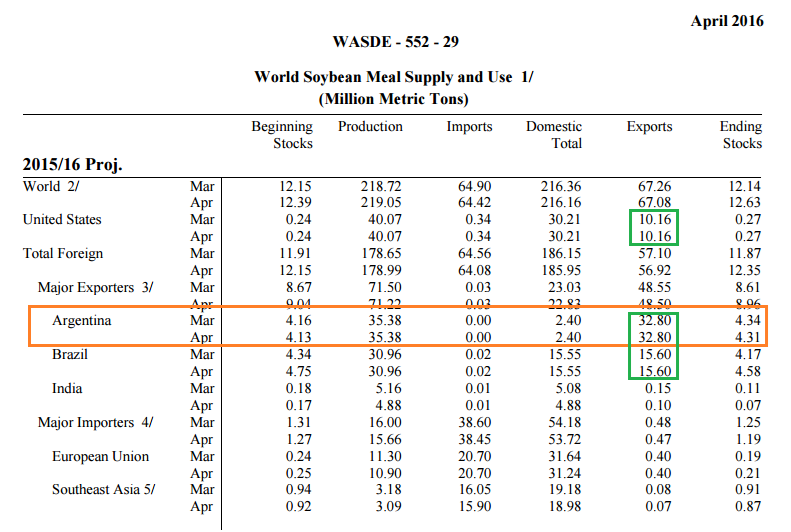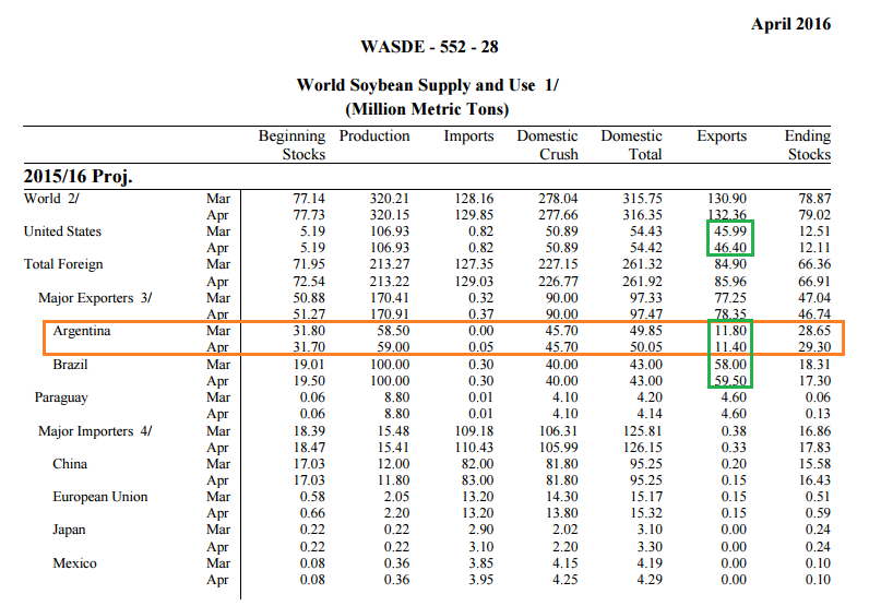 En fait l'Argentine n'est pas un gros exportateur de fève, l'utilisation est surtout domestique pour le crush et l'industrie biodiesel. Par contre c'est un joueur majeur dans le tourteau, près de la moitié des exportation mondiale (48%). Donc l'argument des traders n'est pas un rallye de fève, mais plus un rallye de tourteau. Comme quoi s'il y a des retard de livraison Argentine, ou des problèmes quant à la qualité, ce sera un boost pour la fève/meal américaine en fin de saison quand l'inventaire est plus faible. L’Argentine a 8% des part de marché mondial sur la fève (USA + Brésil = 78%), mais c’est le plus gros joueur au niveau du tourteau (92% de la production domestique de tourteau est exporté!)