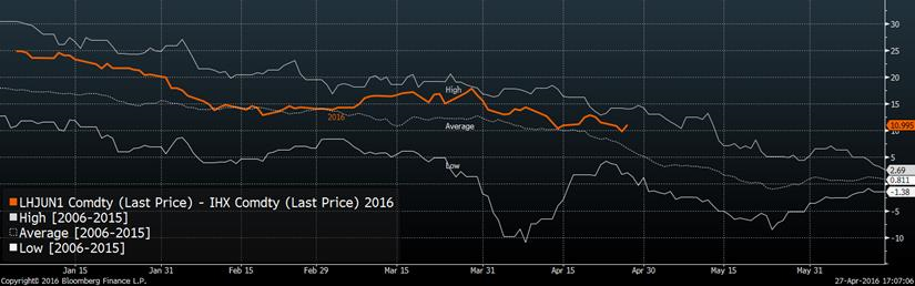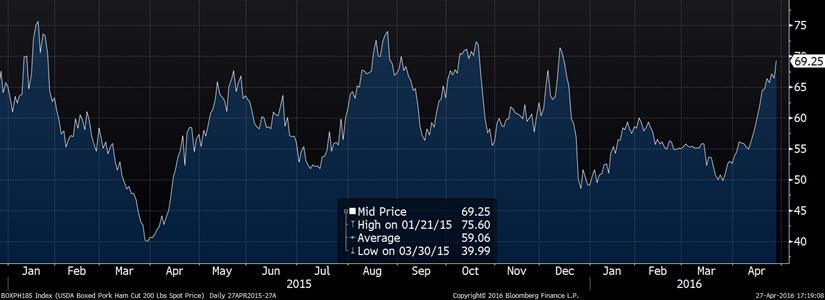 On savait que le prix cash du porc allait tôt ou tard augmenter avec l’arrivé de l’été, mais les marchés commençaient à devenir nerveux après plusieurs semaines de statuquo, expliquant la baisse des prix pour l’été. L’écart entre les prix d’été et le prix cash était devenu anormalement élevé (graphique 1) ce qui a causé la baisse du marché à termes. Par contre, on commence à voir un peu de lumière au bout du tunnel avec le prix cash qui semble entreprendre son ascension vers le prix estival. Demain, l’indice CME du prix cash sera publié à 69.06 ¢/lb (+0.58) ce qui sera la 7ème hausse consécutive, totalisant un gain de 2.5 ¢/lb.