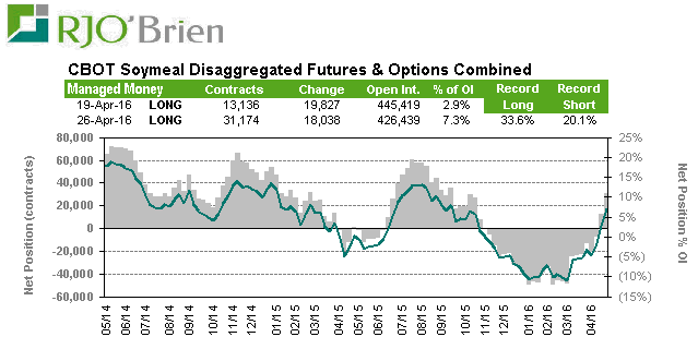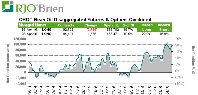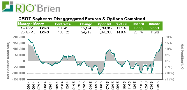 Soybeans : clairement les spéculateurs sont de plus en plus exposés au marché avec 15% de l’open interest. Les producteurs ont répondu à l’appel sur la dernière hausse pour avancer les ventes et on voit clairement que les spéculateurs ont pris la contrepartie des farmers. Les spéculateurs poussent le net long à 160K contrats et les participants commerciaux (producteurs ou utilisateur) sont short 237K. À ces niveaux là il commence y avoir un risque que les spéculateurs se retirent si les perspectives changent. Pour la même raison quand ils sont « trop short » ils peuvent aussi être « trop long ». Le hic avec eux c’est qu’ils sont vite, très vite. « Ce qui monte doit redescendre, vice-versa… »