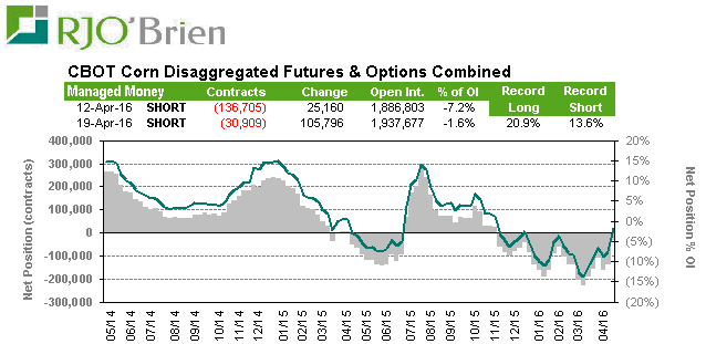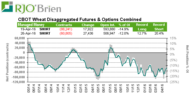 Blé : Les spéculateurs sont rentré dans le grain, mais c’est bien précis ce qu’ils veulent et délaissent complétement le blé. Le blé le grand négligé des récentes emplettes spéculatives. Sur Chicago (blé d’hiver), même si la position de vente est plus faible aujourd’hui, reste que les fonds misent encore fortement sur une baisse des prix. La position nette short de 60k contrats correspond à 12% de l’open interest.