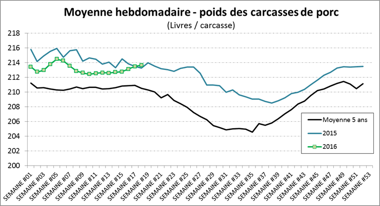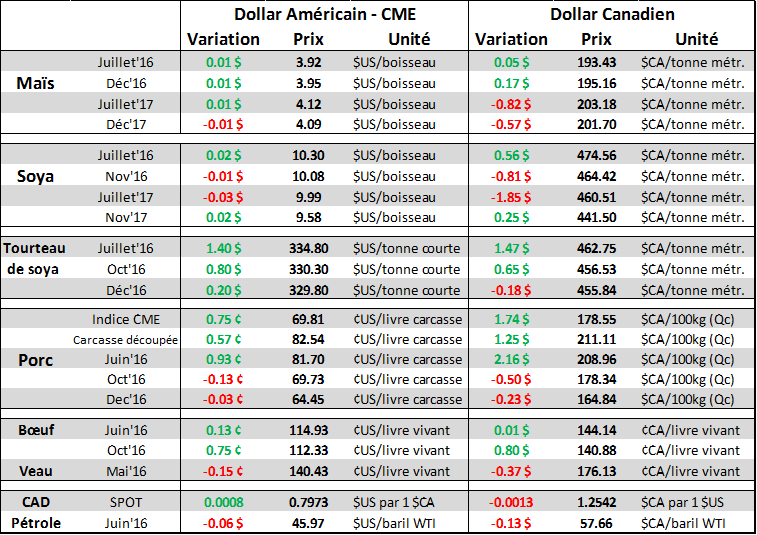 Du côté agricole, on surveillait le volume d’abattages de semaine. Dans le porc, on retour près des quantités de 2015 à 2.14 M têtes (graphique 1) mais le poids des carcasses maintient sa tendance haussière (graphique 2) contrairement à la saisonnalité. C’est la première fois en 2016 que le poids des carcasses surpasse celui de l’an dernier… nous sommes donc à des poids records pour la période actuelle. Concernant le prix cash et le prix du porc découpé, nouveau sommet pour ces deux indices aujourd’hui. L’indice du prix cash sera publié à 70.47 ¢/lb (+0.66) lundi matin, en hausse de 2.79 ¢/lb ces 5 derniers jours… la tendance vers les prix estivaux s’installe, alors que le prix de la découpe fait un nouveau sommet à 82.54 ¢/lb, propulsé par un gain de 4% pour le prix du bacon aujourd’hui. Dans le bœuf, les abattages continuent d’être élevés, à 4.6% de plus que l’an dernier à pareille date. Les abattages de la semaine s’élèvent à 590 000 têtes à un poids moyen de 1361 livres/vivant (+2%). La production de bœuf s’établit donc à 485.8 M livres cette semaine ce qui est 6.3% de plus qu’en 2015. Face à la production plus élevée