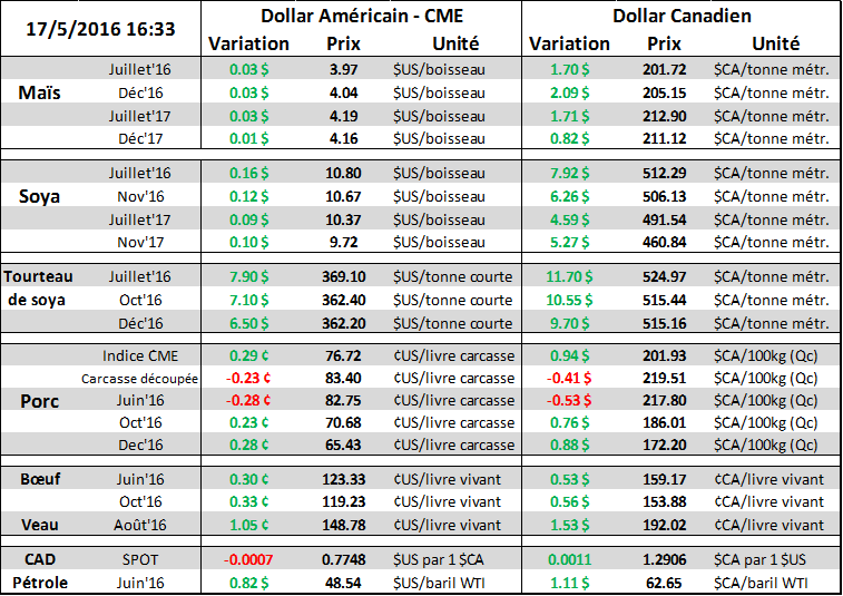 Le prix des oléagineux continuent de monter alors que la situation en Argentine se stabilise et des températures plus sèches ces prochaines permettront l’avancement de la moisson ce qui aidera à évaluer les dommages. Les prix du tourteau et de la fève de soya sont à leur plus haut niveau cette année alors que celui du canola n’est pas très loin du sommet de la semaine dernière. La raison de la hausse d’aujourd’hui n’est pas très bien définie… c’est peut-être juste une continuation de l’effet du rapport USDA de la semaine dernière prévoyant une baisse des réserves si l’acréage n’augmente pas comparativement aux intentions d’ensemencement de mars. De plus, les spéculateurs additionnent fort probablement sur leurs positions acheteurs, prenant ainsi la contrepartie des producteurs. La position des spéculateurs a dépassé le 200 000 contrats le 10 mai et a possiblement continué d’augmenter depuis. La majorité des analystes maintiennent leur cible de prix bien plus bas que la valeur actuelle, en attente du rapport du 30 juin qui confirmera s’il y a eu un changement d’acréage. On note tout de même que le phénomène de moins d’acres pour les grains et plus pour les oléagineux a déjà commencé en Europe. Les agriculteurs allemands ont semé plus de canola et moins de blé cette année. L’Allemagne est le deuxième plus important producteur de blé en Europe après la France et la production allemande est prévue pour diminuer de presque 4% cet été à 25.5 millions tonnes de blé alors que la production de canola augmentera de presque 2% à 5.1 millions tonnes.