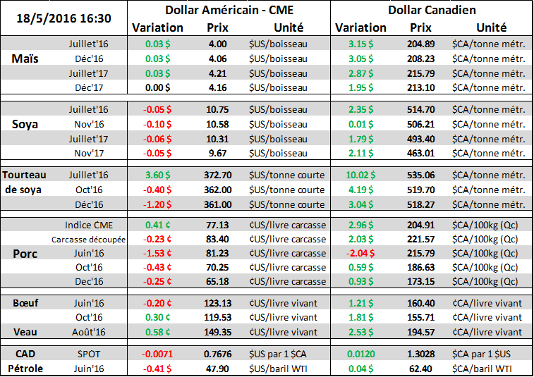 Enfin, nous avons vu aujourd’hui une forte volatilité quant au dollar canadien – ou indirectement le dollar américain avec la FED qui rendait public les discussions de leur dernière rencontre. En fait le marché tente continuellement de voir, prévoir ou anticiper un changement quant à la politique monétaire aux États-Unis qui a inévitablement un impact sur les devises. La grande question actuellement est de savoir quand sera la prochaine hausse de taux d’intérêt chez nos voisins du sud. Le marché s’attend à voir une hausse cette année, mais quand. Les probabilités ont fortement changé dans les derniers jours pour le meeting du 15 juin puisque le discours actuel laisse encore la possibilité de revoir les taux « si l’économie le permet ». La structure du marché s’ajuste en conséquence et l’impact se fait ressentir avec un dollar US plus fort et donc par opposition un dollar canadien plus faible. C’est un net changement d’air puisque le mois passé la probabilité implicite selon les 30-Day Fed Funds Futures étaient de seulement 1.2% pour une hausse de taux. Aujourd’hui c’est 34%. À mon avis il faudra voir des chiffres économiques assez fort pour forcer la main des américain à hausser les taux une semaine avant le référendum en Europe à savoir si le Royaume-Unis décide de quitter l’Union Européenne.