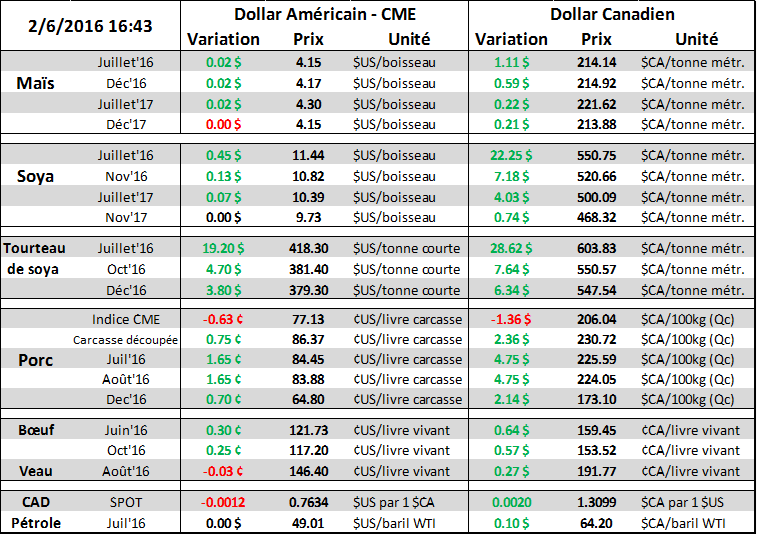 · Nouveau sommet pour le prix de la fève et tourteau de soya : 11.40 $US/boiss. et 419 $US/TC respectivement