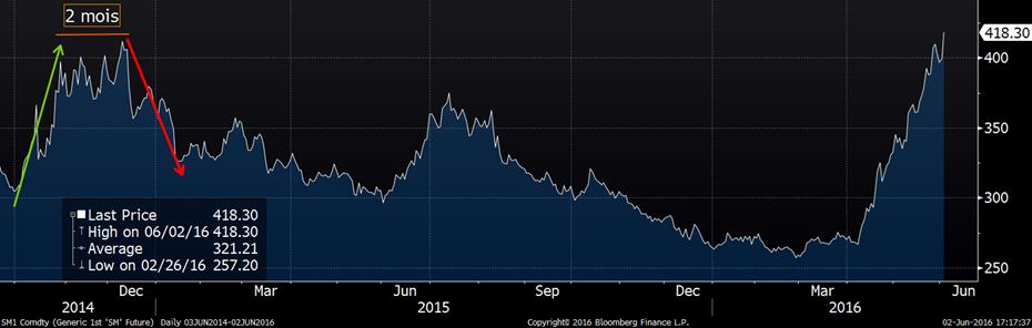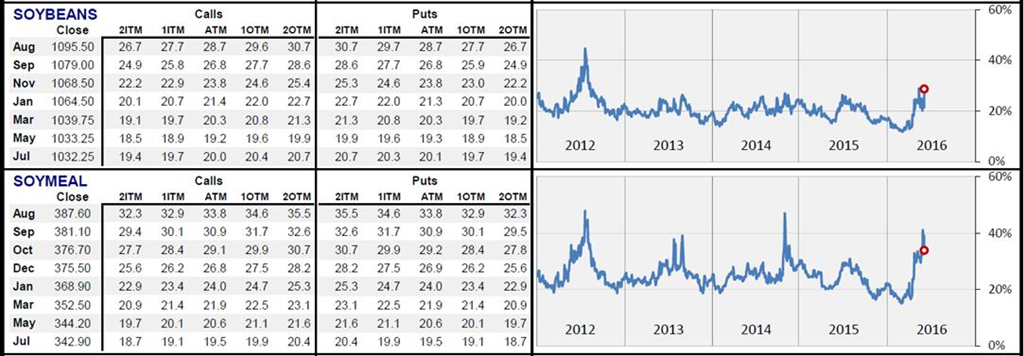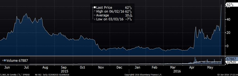 Au risque de se répéter, le prix du soya continue de monter, particulièrement le contrat de juillet. Aujourd’hui seulement, le prix de la fève de soya a augmenté de 4%, soit de 0.44 $US/boisseau alors que le contrat de novembre 2016 a augmenté de 1%... et le contrat de novembre 2017 a baissé! La structure à termes du complexe de soya démontre de plus en plus une forte demande à court terme (graphique 1). Il y a deux mois, les prix de l’ancienne récolte étaient inférieurs à ceux de la nouvelle récolte, le marché était en « contango » reflétant l’abondance de fève. Il y a un mois, la valeur du soya de l’ancienne récolte devenait légèrement supérieur à celle de la nouvelle récolte et aujourd’hui, et maintenant le prix de la livraison immédiate est rendu 6% plus cher que le soya de la nouvelle récolte. La structure à terme est désormais en « backwardation ». Évidemment, la situation est très similaire pour le tourteau. Ce changement de structure à terme coïncide normalement avec une hausse de la volatilité ce qui est effectivement le cas (graphique 2). La volatilité implicite des options a pratiquement doublé depuis 2 mois (graphique 2) démontrant une hausse de l’incertitude se traduisant pour une augmentation de la valeur des options (assurances). Aussi, ce changement de structure représente un risque au niveau des spreads spot/nouvelle récolte. Comme aujourd’hui, l’écart entre le contrat de juillet et novembre a littéralement doublé, passant de 30¢/boisseau à 60¢/boisseau (graphique 3).
