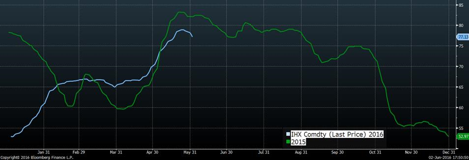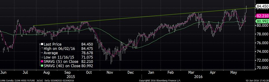 Par ailleurs, le prix du porc sur juillet et août ont tous deux percé leur résistance, fermant à un nouveau sommet (graphique 5). Bien que le prix cash continuait à baisser selon les données d’abattage du 1er juin, le prix de la découpe monte de près d’une cent/jour, présentement à 86.37 ¢US/lb. Aujourd’hui, c’est le prix du bacon qui a propulsé la valeur de la carcasse découpée, le flanc est rendu à 1.14 $US/lb en hausse de 5.6%. Techniquement, c’est positif pour le prix de juillet et août, d’avantage si on reste au-dessus de la résistance après la fermeture de demain. En dollar canadien, le prix pour juillet a bondi de 5$CA/tête pour clôturer à 225 $CA/100kg. Toutefois, il faut rester prudent. La faiblesse du prix cash ressemble à l’an dernier alors que le haut de l’année était au mois de mai (graphique 6). L’indice du prix cash sera publié a presque ½ ¢/lb à la baisse demain matin, agrandissant l’écart avec les livraisons de juin à des niveaux anormalement élevés.