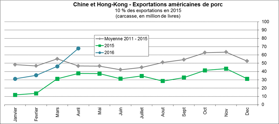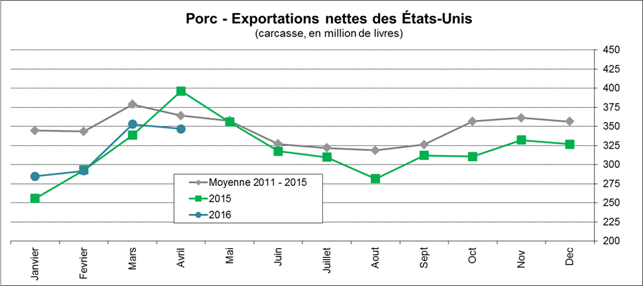 · Exportations américaines de porcs en avril : 347 M livres, sous 2015 et la moyenne