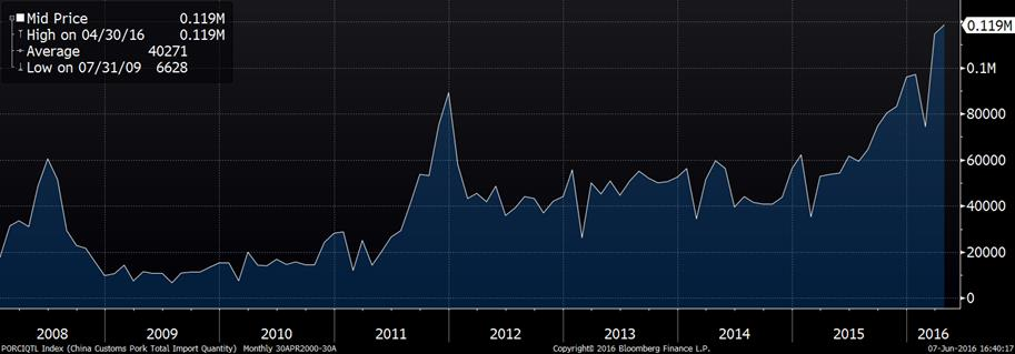 À ce qu’on peut lire, l’augmentation de 6¢ la livre de porc depuis une semaine est principalement expliquée par des anticipations d’une forte demande chinoise cet été. Bien que les données d’exportations d’avril démontre une amélioration de la demande chinoise pour le porc américain, il ne faut pas oublier qu’il existe des acheteurs beaucoup plus importants. Au net, les États-Unis ont vendu 347 millions de livres en avril ce qui est moindre qu’en mars, qu’en avril 2015 et qu’en moyenne (graphique 1). Il n’y a rien d’alarmant, surtout que la baisse de 12.5% des exportations comparativement à avril 2015 est principalement dû au volume élevé de ce mois suite aux retards de livraison qui avaient en raison des grèves des stations portuaires de la côte ouest américaine à l’hiver 2015. Cela se reflète très bien sur les exportations de porcs vers le Japon qui ont chuté de 28% comparativement à avril 2015 (graphique 2). Concernant le plus important acheteur de porcs américains, le Mexique, le volume d’avril était aussi en baisse, mais de seulement 6% à 115 M livres. De retour à la demande chinoise, les ventes américaines ont atteint un sommet depuis 2 ans à 73 M livres (graphique 3) ce qui est presque le double des ventes de janvier. En considérant les achats records des chinois en avril, avec 119 000 tonnes de porcs étrangers (graphique 4), la part de marché des américains représente 27% des achats de la Chine. Donc, si le volume des ventes vers la Chine continue de croitre au rythme actuel, oui c’est possible d’avoir une très forte demande cet été. Cependant, le prix des retailles a atteint son sommet au début mai et a reculé depuis ce qui pourrait être un indicateur comme quoi la demande chinoise pour le porc américain a ralenti. Ce n’est toutefois pas le cas du prix du porc en Chine, présentement à 4.08 $US/kg (prix en gros), de retour au sommet de 2011.