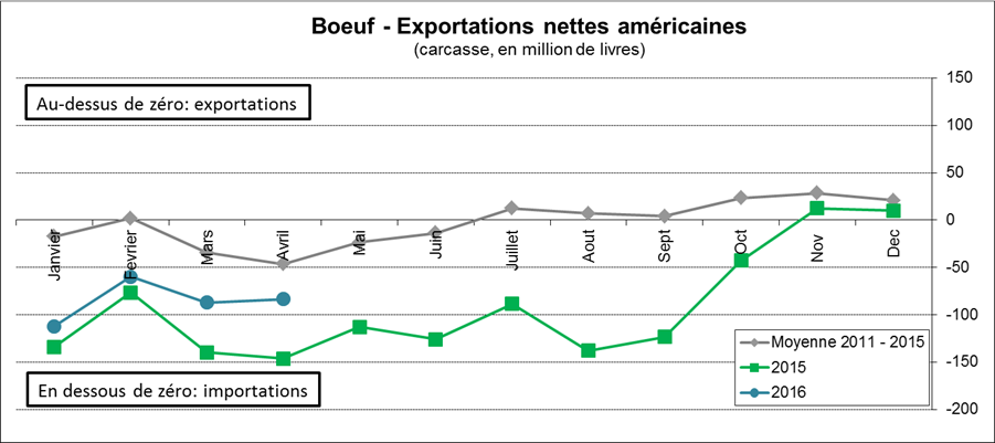 Aussi, il ne faut pas oublier les importations de porcs vivants vers les États-Unis ce qui s’ajoutent au cheptel commercial. Ces 12 derniers mois, les américains ont acheté 17% plus de porcelets canadiens, pour un volume d’environ 300 000 têtes par mois (graphique 5). C’est une hausse notable. Par ailleurs, les américains continuent d’acheter du bœuf de l’Océanie et du Canada. Les importations nettes du mois d’avril étaient de 83 millions livres, légèrement moins qu’en mars (graphique 6). Les américains avait vendu pour 189 millions livres à l’étranger, principalement vers l’Asie, alors qu’ils ont acheté 272.5 millions livres.