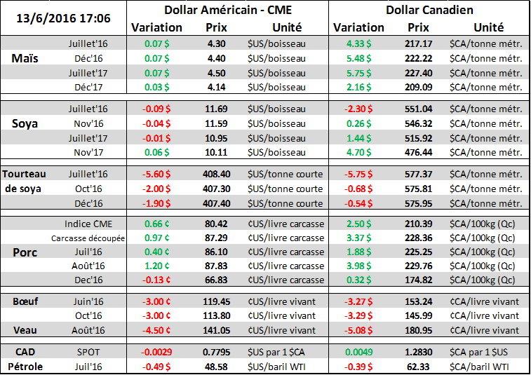 · Production de boeuf de 477.9 M lbs, 8.9% de plus qu’en 2015. Le prix finit la journée « limit down »