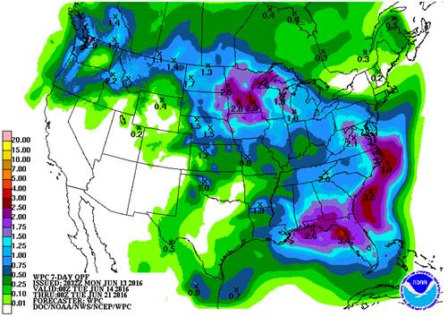 Image 2 – Prévision des précipitaions du 14 au 21 juin (en pouce)