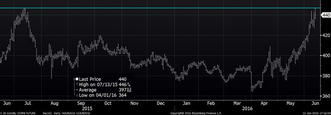 Graphique 1 – Prix du maïs, livraison décembre 2016 (¢US/boisseau)