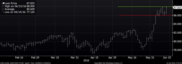 · Le prix du porc sur août est nez-à-nez avec sa résistance à 88 ¢/lb