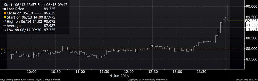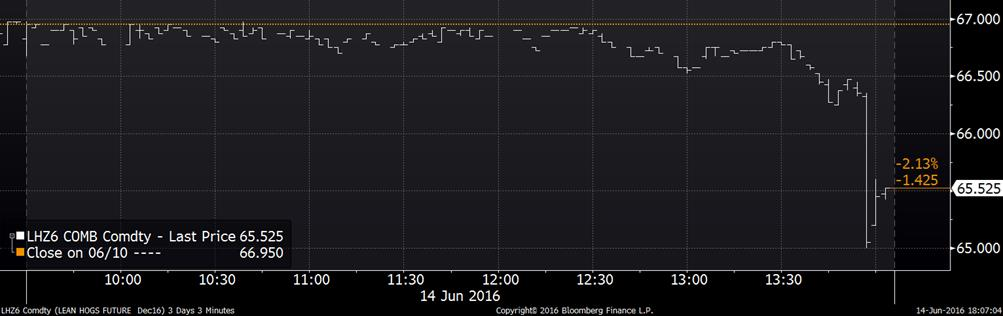 Finalement, un petit commentaire pour souligner la fermeture du prix du porc. Alors que la journée s’avérait tranquille, le prix des livraisons d’août a commencé à augmenter dans la dernière demi-heure puisque la résistance de 88.00 ¢/lb avait été brisée (graphique 3). Dans le dernier 15 minutes de la jour, le prix est passé de 88.50 à 90.00 ¢/lb. Le plus cocasse est la réaction des livraisons de décembre pendant cette période (graphique 4), le prix a plongé de 66.50 à 65.00 très rapidement. L’écart entre les prix d’été et d’hiver a donc explosé à la fermeture et rien n’apparait sur le fils de presse pour expliquer le mouvement anormal. Le prix du porc découpe a terminé la journée à 87.83 ¢US/lb (+0.54).