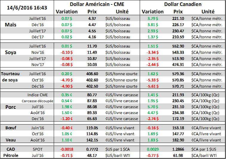 Hier, la firme de recherche Informa Economics publiait ses prévisions pour les acréages américains lesquelles coïncident avec les changements de prix au printemps. Dans le soya, ils augmentent l’acréage planté à 83.8 millions acres versus leur estimé précédent de 83.0 millions, ils prévoient donc une hausse de 1.6M acres depuis le sondage du mois de mars établi à 82.2 millions d’acres. Ils ont aussi diminué leurs estimés pour les ensemencements de maïs. Présentement, ils prévoient 92.6 M acres comparativement à leurs prévisions de 93.4 M en mai, ce qui donnerait au final une baisse de 1 million d’acres depuis les intentions de mars. Le rapport officiel de l’USDA sur les acréages des cultures sera publié le 30 juin, en même temps que les inventaires de grains en date du 1er juin.