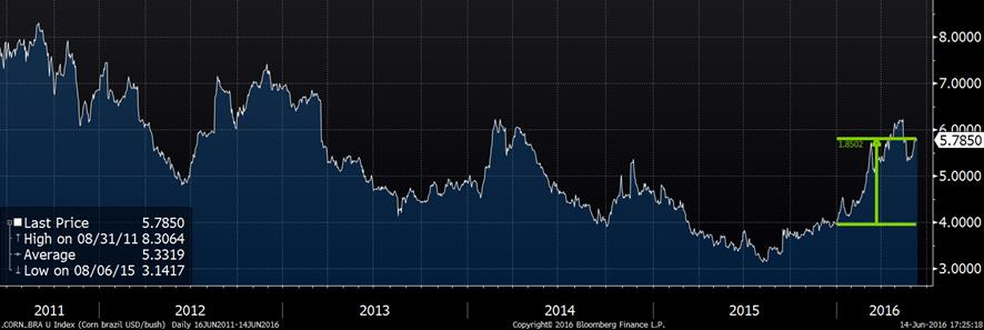 Actuellement, le prix des grains ressemble à une partie de souque à la corde : d’un côté nous avons la bonne condition des cultures américaines qui tire les prix vers le bas ; de l’autre côté nous avons la demande pour l’exportation qui tire le prix vers le haut. À court terme, je dirais que la demande semble la plus forte et traine la production américaine dans la bouette! Bien que nous avions des chiffres étonnamment bons concernant la condition des cultures aux États-Unis, le prix du maïs à tout de même finit la journée à 4.46 ½ $US/boisseau… toujours incapable de surmonter le sommet de l’été dernier qui était 4.46 ¾, mais on ne peut pas dire qu’on est loin. Techniquement, si on brise cette résistance, la prochaine cible s’avère très loin du prix actuel, soit 4.90 $US/boisseau. Pourquoi les perspectives pour l’exportation sont si fortes ? Le prix au Brésil est plus cher qu’aux États-Unis en raison du manque d’eau en avril-mai. Depuis le 1er janvier, le prix du maïs à la Bourse du Brésil a augmenté de 1.85 $US/boisseau, présentement à 5.78 $US/boisseau lorsque converti au taux BRL/USD du jour (graphique 1). Historiquement, il y a une bonne relation entre les prix au Brésil et aux États-Unis (graphique 2) et dernièrement, le prix américain traine de la patte. Toutefois, faut rester prudent avec les prix boursiers puisque la valeur du maïs FOB au port de Paranagua est juste au-dessus de 5.00 $US/boisseau (la base est donc négative). Cela reste tout de même au-dessus des prix américains, sans compter les problèmes de logistique possible en Amérique du Sud.