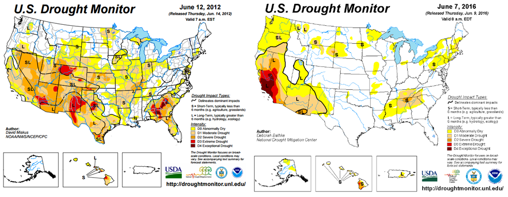 Absence de sécheresse : carte de sécheresse 2012 versus 2016. La situation actuelle est bien moins colorée.
