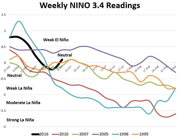 Changement El Nino / La Nina : pour l’instant c’est neutre (via Commodity Weather Group). Un effet LaNina fort augmente les chances d’un été chaud/sec