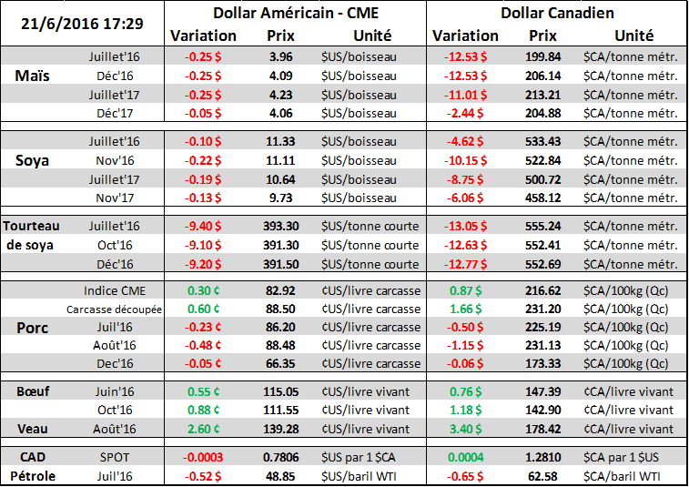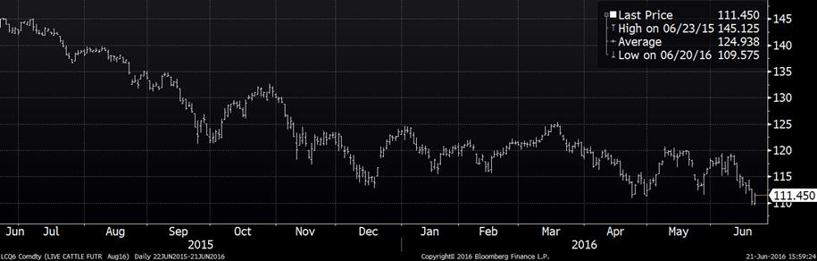 Le prix du bœuf a aussi connu un début de semaine difficile. Hier, le contrat pour les livraisons d’août s’est transigé à 109.95 ¢us/lb (graphique 3), son plus bas niveau depuis l’été 2011! L’augmentation de la production hebdomadaire de presque 10%, principalement dû à un volume d’abattage plus élevé que l’an dernier, met beaucoup de pression sur la valeur du bœuf. De plus, les estimés pour le rapport Cattle-on-Feed de vendredi prévoient 2.1% plus d’animaux en parc qu’en 2015, avec des placements 9.6% plus élevés en mai. Ne pas oublier qu’il y avait une journée de semaine de plus en 2016 que l’an dernier, il est donc normal que les chiffres de placement et de commercialisation soient supérieurs. Aussi, vendredi, en même temps que le rapport Cattle-on-Feed, il y aura le rapport des inventaires surgelés et le rapport trimestriel Hogs and Pigs sur le cheptel porcin américain.