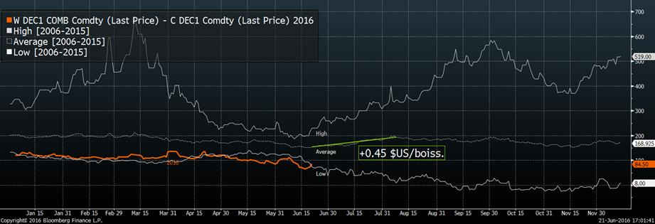 On note aussi que l’écart entre le prix du blé et maïs sur décembre 2016 a récupéré environ 0.20 $US/boisseau depuis le début de la semaine, présentement à 0.85 $US/boisseau. Historiquement, cet écart tend à augmenter entre la mi-juin et la fin juillet (graphique 2), à l’exception de 2011 alors que la récolte de blé s’était bien passée contrairement à la pollinisation du maïs (trop chaud/sec). Notre analyste en chef à Chicago, Richard Feltes, explique cette saisonnalité par la pression sur le prix du blé qui se fait présentement récolté, il y a donc aucune incertitude concernant la récolte américaine. On parle d’une énorme récolte de blé, peut-être même surestimée, le prix est donc déjà à terre. En contrepartie, il y a encore une prime de risque dans le prix du maïs, une prime pour la météo. Si la pollinisation à la fin juillet se passe bien, cette prime s’évapora ce qui fera baisser le prix du maïs relativement au prix du blé. Cette prime de risque est d’ailleurs justifiée, comme en 2011 alors que la pollinisation ne s’était pas bien passer contrairement à la moisson de blé d’hiver. Cette saisonnalité est aussi présente dans la volatilité implicite des options de blé et maïs. Vers la fin juin, il y a peu d’incertitude dans le marché du blé d’hiver comparativement au maïs, donc les assurances sur le prix du maïs sont plus dispendieuses. Par exemple, aujourd’hui, des options at-the-money dans le maïs pour septembre coûte 6% de la valeur du grain versus 4.5% dans le blé… après la pollinisation du maïs, il y a de forte chance que le coût des assurances se rapproche entre le maïs et blé ce qui pourrait jouer en faveur pour l’écart blé-maïs.