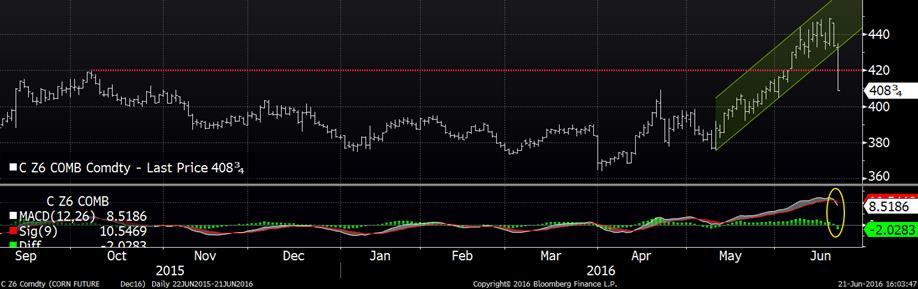 Après avoir terminé la semaine à son plus haut prix depuis 2014, le maïs connaît une dure semaine avec une baisse de 9% en 48 heures. Tel que décrit dans notre commentaire d’hier, la correction des prix des grains était particulièrement attribuée aux prévisions de pluies sur le Cornbelt, effaçant les inquiétudes d’une potentielle sécheresse à court terme. À cela s’ajoute le début des battages au Brésil, pays où les inventaires de maïs sont à sec. L’arrivée de cette nouvelle récolte est grandement appréciée par les éleveurs brésiliens qui faisaient face à des prix de grains très élevés. Juste aujourd’hui, le prix du maïs à la bourse du Brésil a perdu 0.35 $US/boisseau ce qui diminue le perspective des exportations américaines en même temps que la production reste potentiellement très bonne. Techniquement, il y a eu deux brisures importantes durant la séance d’aujourd’hui (graphique 1) : on est sortie de la tendance haussière et ensuite, on a brisé le support de 4.20 $US/boisseau. Face à ces changements des fondamentaux et techniques, le message de la journée était de vendre ce qui a poussé le prix jusqu’à la limite journalière de 0.25 $US/boisseau. Ce message a bien été entendu des spéculateurs qui ont liquidé le 1/5 de leur position d’achat de maïs, soit 47 000 contrats aujourd’hui. Il faut garder en tête qu’ils détiennent toujours approximativement 200 000 contrats net en achat. Malgré cette dégringolade, le prix du soya s’est bien maintenu, en baisse de seulement 3.5% depuis le début de la semaine.