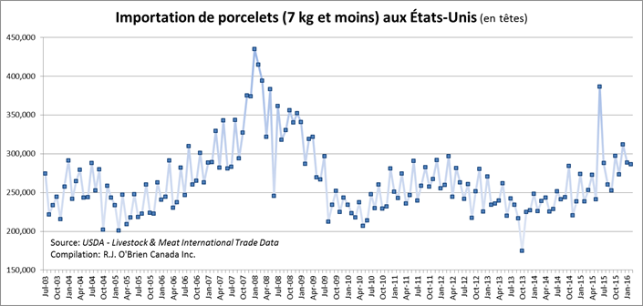 o 120 – 179 lbs : 13.03 M porcs (+0.3%) à Abattages de mi-juillet à fin août. En hausse comparativement les prévisions de -0.4% en mars en raison d’importations massives de porcelets du Canada (voir graphique)
