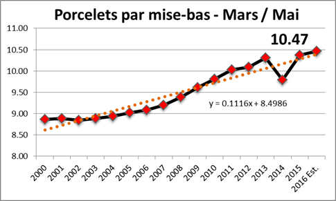 o Porcelets par portée : 10.47 (+0.9%) à Suit la tendance historique de +0.1 porcelets par année (voir graphique ci-dessous)