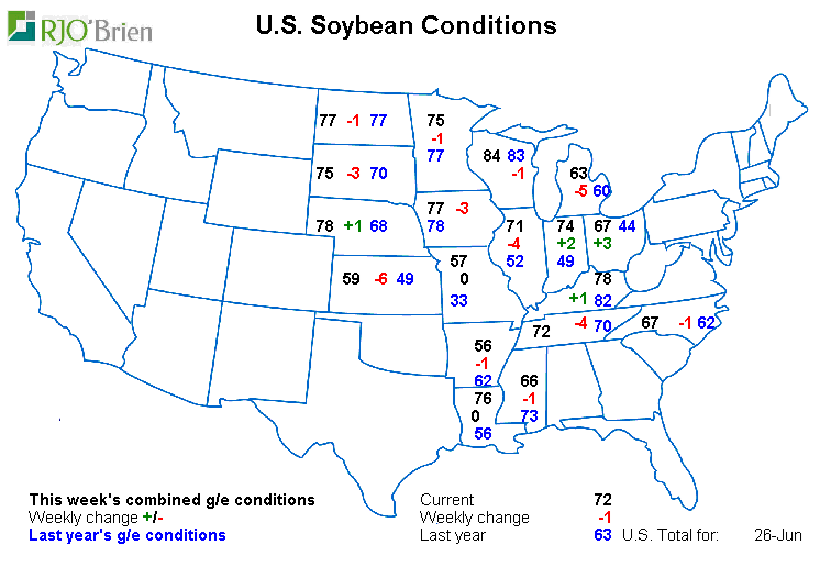 Soja : la qualité du soja baisse de 1% cette semaine à 73% de bonne ou excellente condition. Comparativement à l’an dernier à 63%, le soja va très bien mais rien n’est fait car il est encore tôt dans la saison. On peut essentiellement dire que l’émergence est chose du passé avec 95% qui est sorti de terre. Un peu comme dans le mais certains états du sud commence la transition entre le stade végétatif et le state reproductif avec le début de la floraison (R1). En date du 26 juin l’USDA estime la floraison à 9% principalement dans les états très au sud comme la Louisiane le Mississipi et l’Arkansas. Les états plus au nord or la récolte est plus importante devrait voir R1 dans quelques semaines encore, à partir de la mi-juillet.
