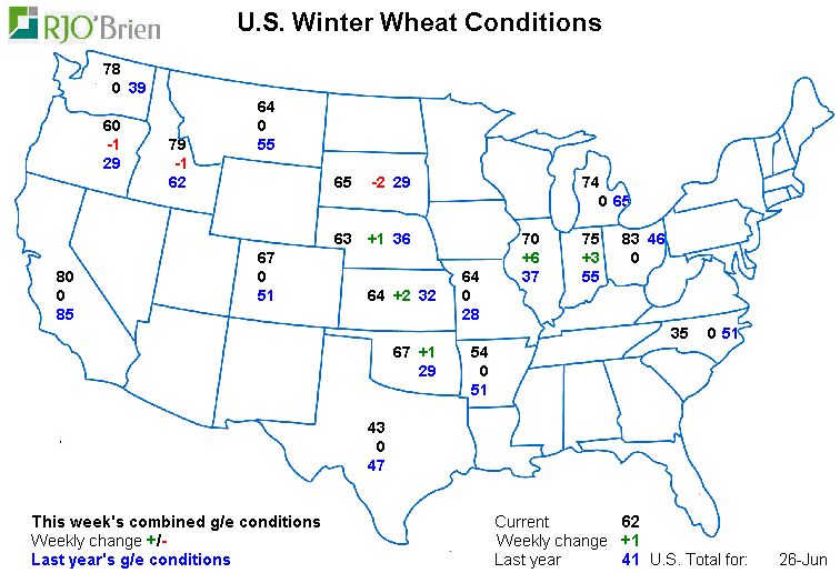 Blé d’hiver: la récolte va bon train avec 45% de sorti des champs. Les producteurs du Kansas vont mettre la 4e vitesse pour avancer les battages (58% actuellement, versus 50% en moyenne) avant que la pluie s’amène mercredi. Les cartes météo montrent des accumulations de 3 à 5 pouces d’eau du 28 juin au 5 juillet qui va nécessairement freiner les récoltes et augmenter le risque de toxines dans le grain. Je parle de risque de toxine, mais de manière générale le blé est d’excellente qualité avec des rendements qui fracassent des records. L’USDA a encore augmenté les conditions à 62% bon/excellent comparativement à 61% la semaine dernière et 40% l’an passé. Le blé est loin d’être dans le trouble malgré les précipitations prévues.