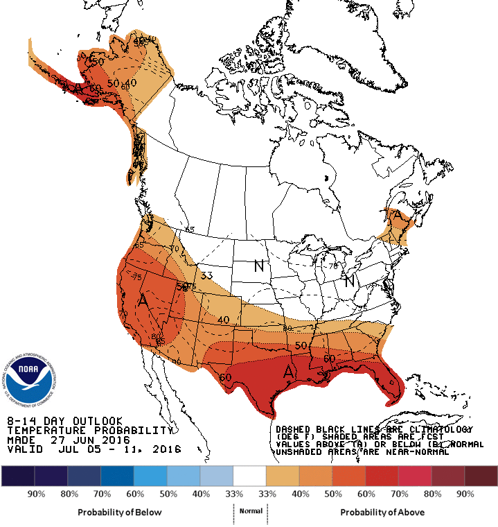Cartes météo : forecast long terme 8/14 jours qui s’étalent du 5 au 11 juillet montrent une probabilité de précipitations sur le cornbelt et des températures près des normales saisonnière.