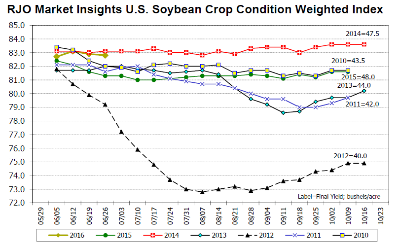 · Soja : en bonne condition 72% good/excellent, 73% semaine passée et 63% en 2015